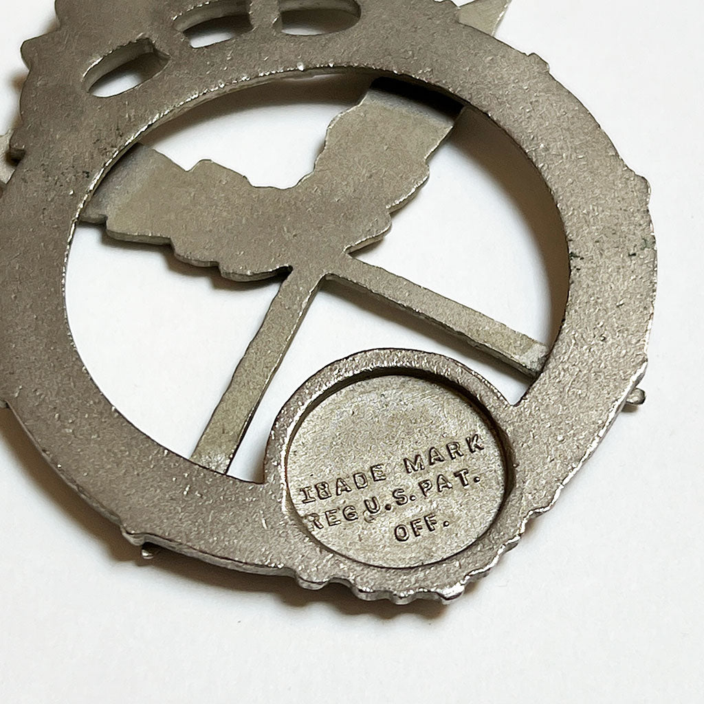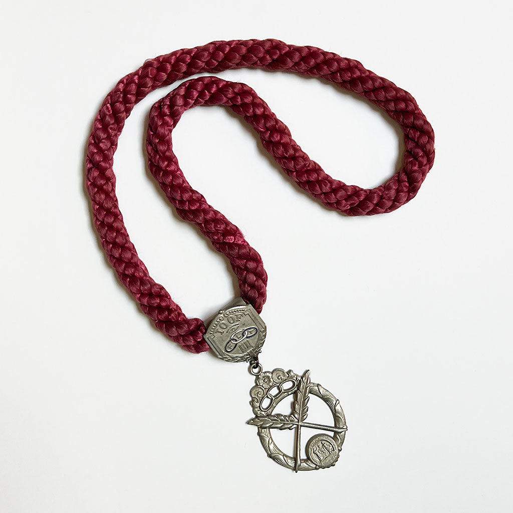 Here, an Independent Order of Odd Fellows (IOOF) ceremonial necklace made from thick braided cord with a beautifully detailed large pendant drop. The fastener connecting the cord to the pendant is detailed with an open book, eye and the three rings in red, white and blue enamel with letters representing Friendship, Love and Truth. The pendant features crossed double feather quills and three links of chain. Both the fastener and pendant have decorative flourishes framing each piece.