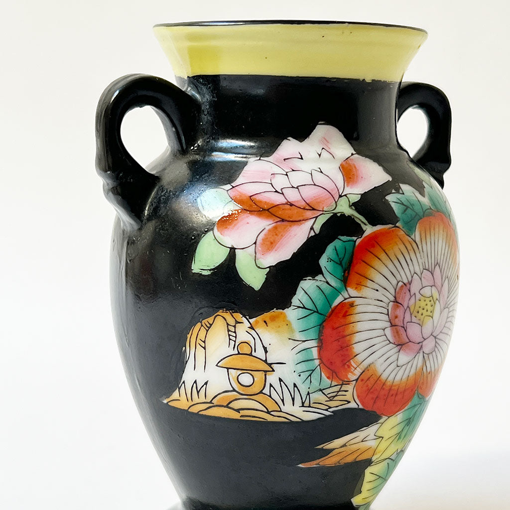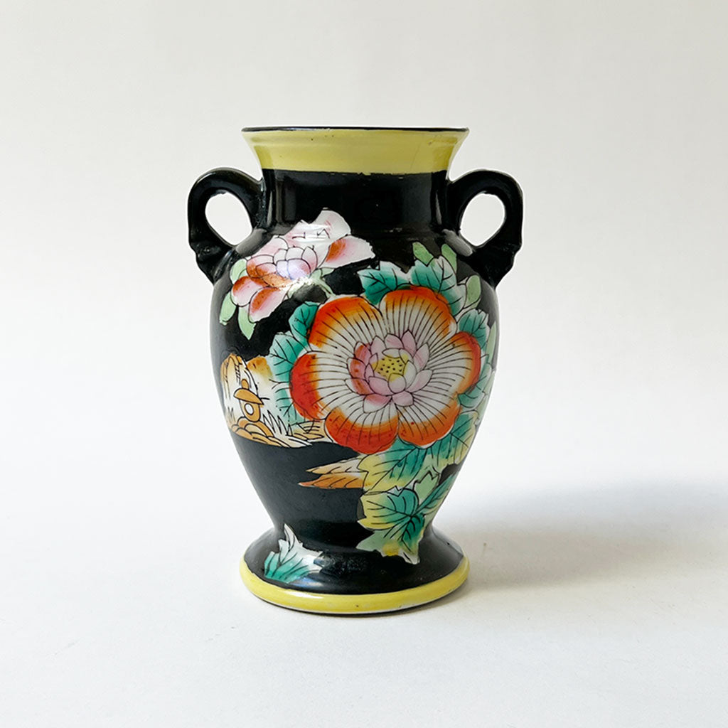 Here, a vintage double handle ceramic vase with hand painted floral details on an unusual black background. We love the classical shape of this small vase and the different floral designs on both sides because it's like two vases in one!