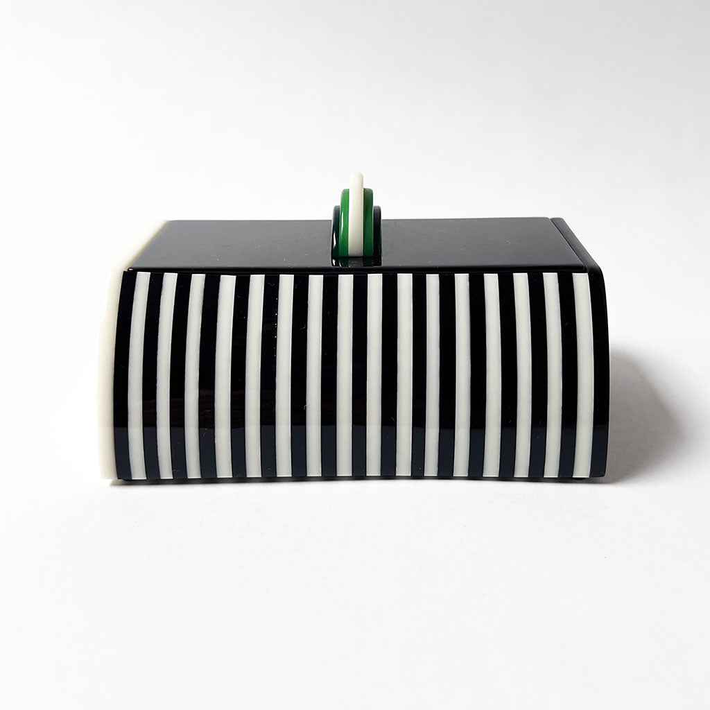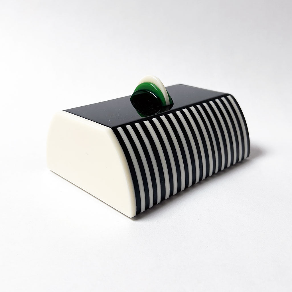 The smooth, polished surfaces and sophisticated color combinations of these stacked lucite boxes by Finn remind us of vintage bakelite pieces from the 1930's and 40's. Made from new and repurposed lucite, these beautifully crafted boxes are perfect for storing jewelry or other small keepsakes. Added bonus: the graphic patterning and bold colors make them terrific decorative accessories sure to liven up a table top, nightstand or dresser.