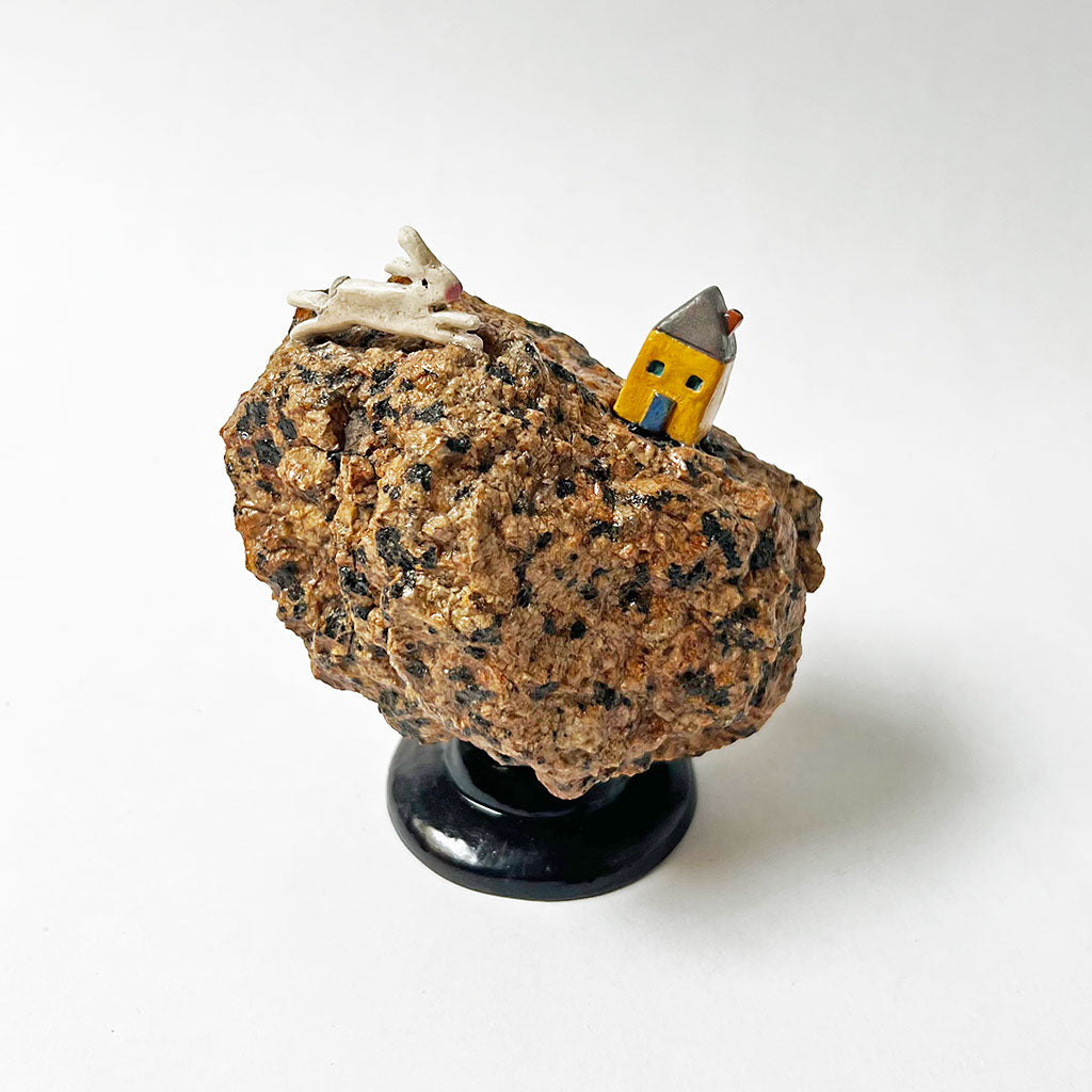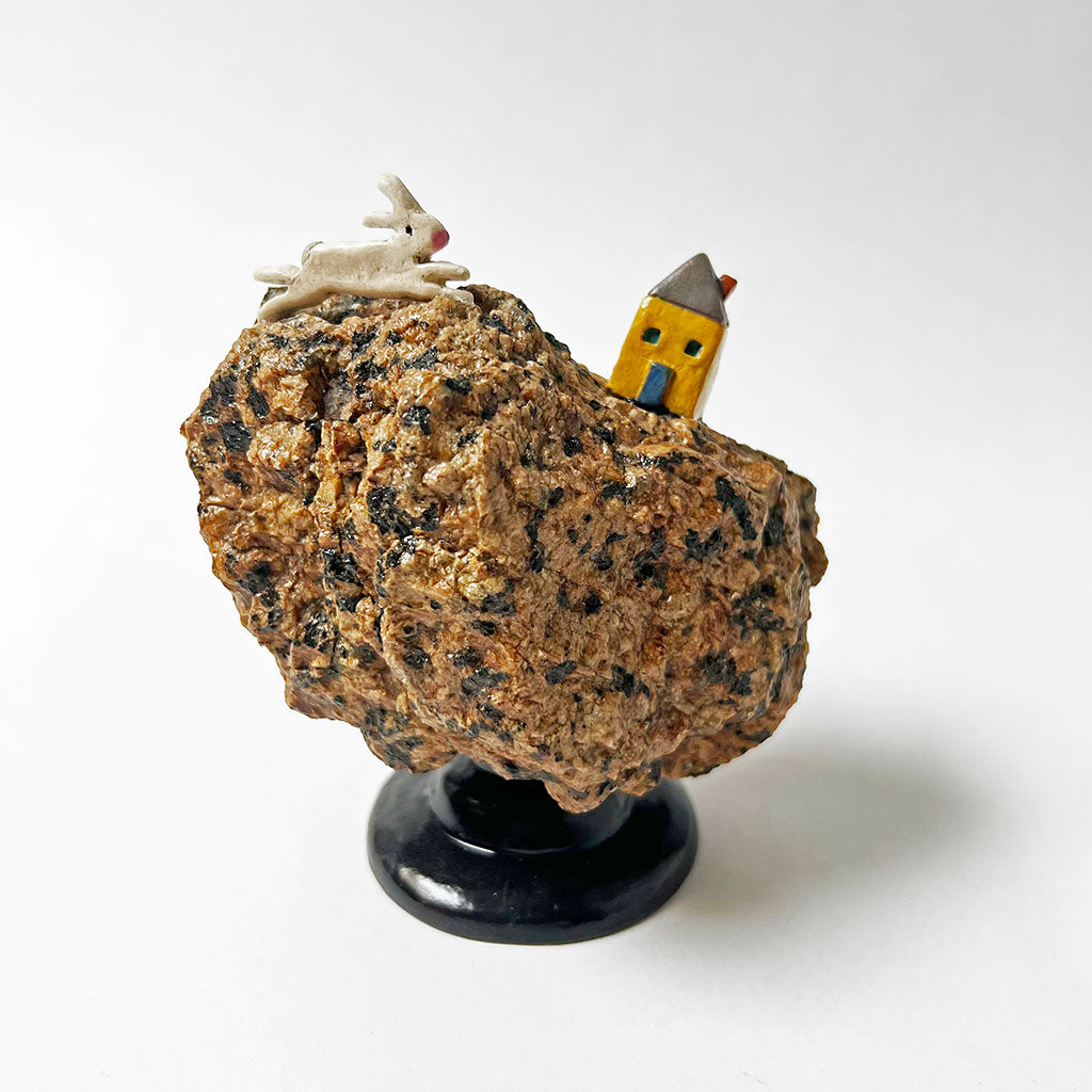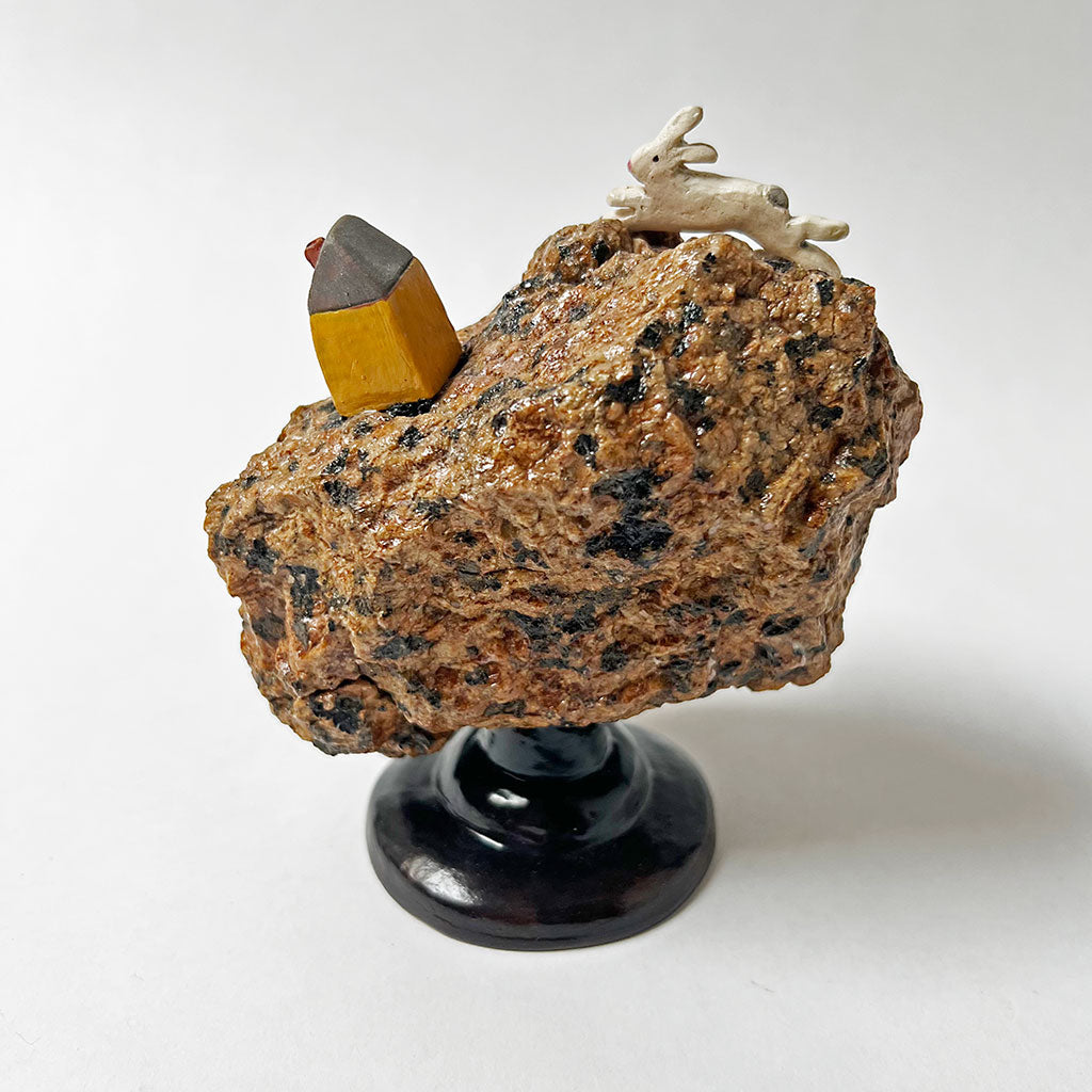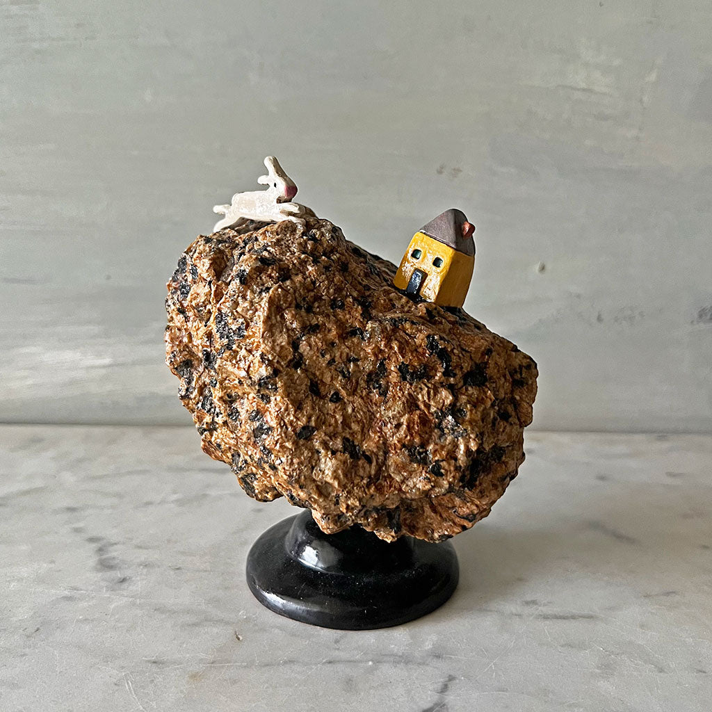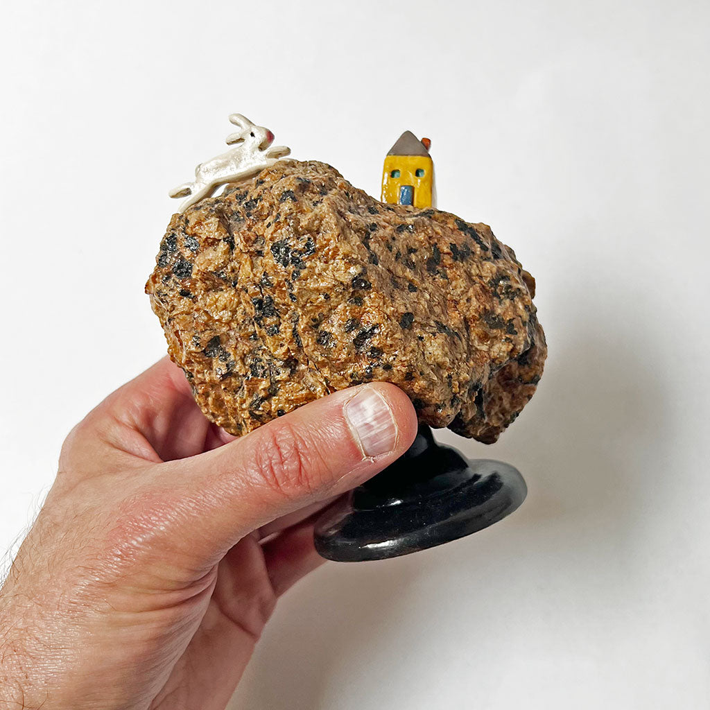 About 5" tall x 4.25" wide x 3" deep. Glazed white earthenware & found stone.