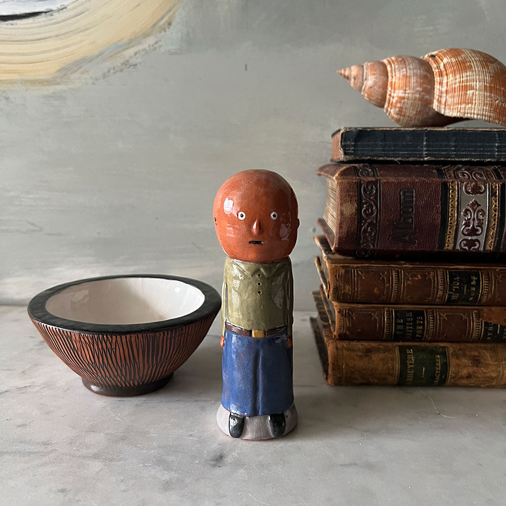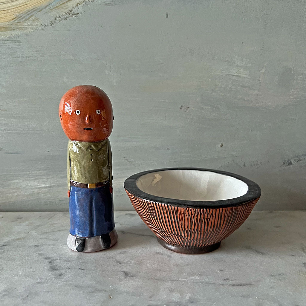 About 4.5" tall x 6" wide x 4.5" deep. Bowl measures about 2" tall x 4.5" diameter. Figure measures about 5.25" x 1.75" wide x 1.75" deep. Glazed white earthenware.