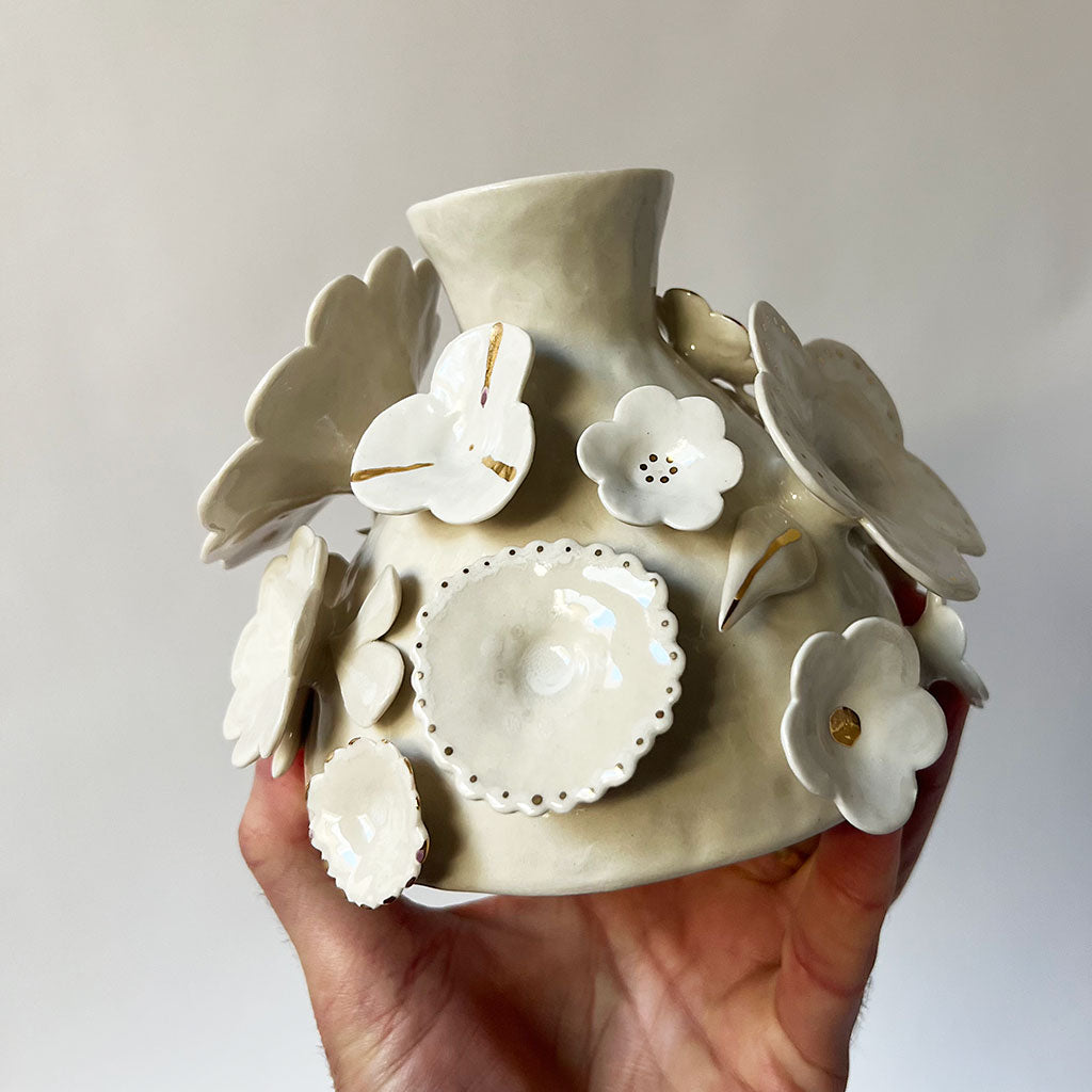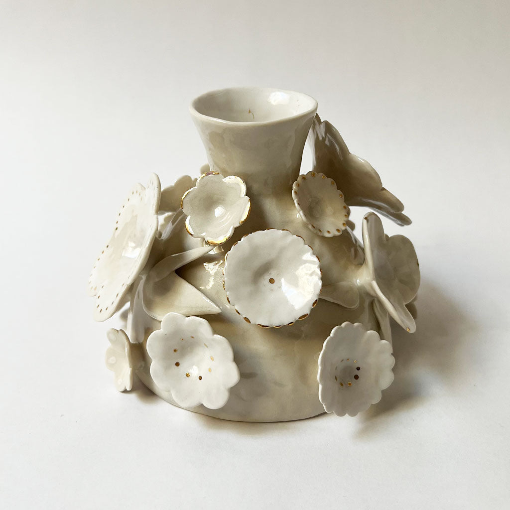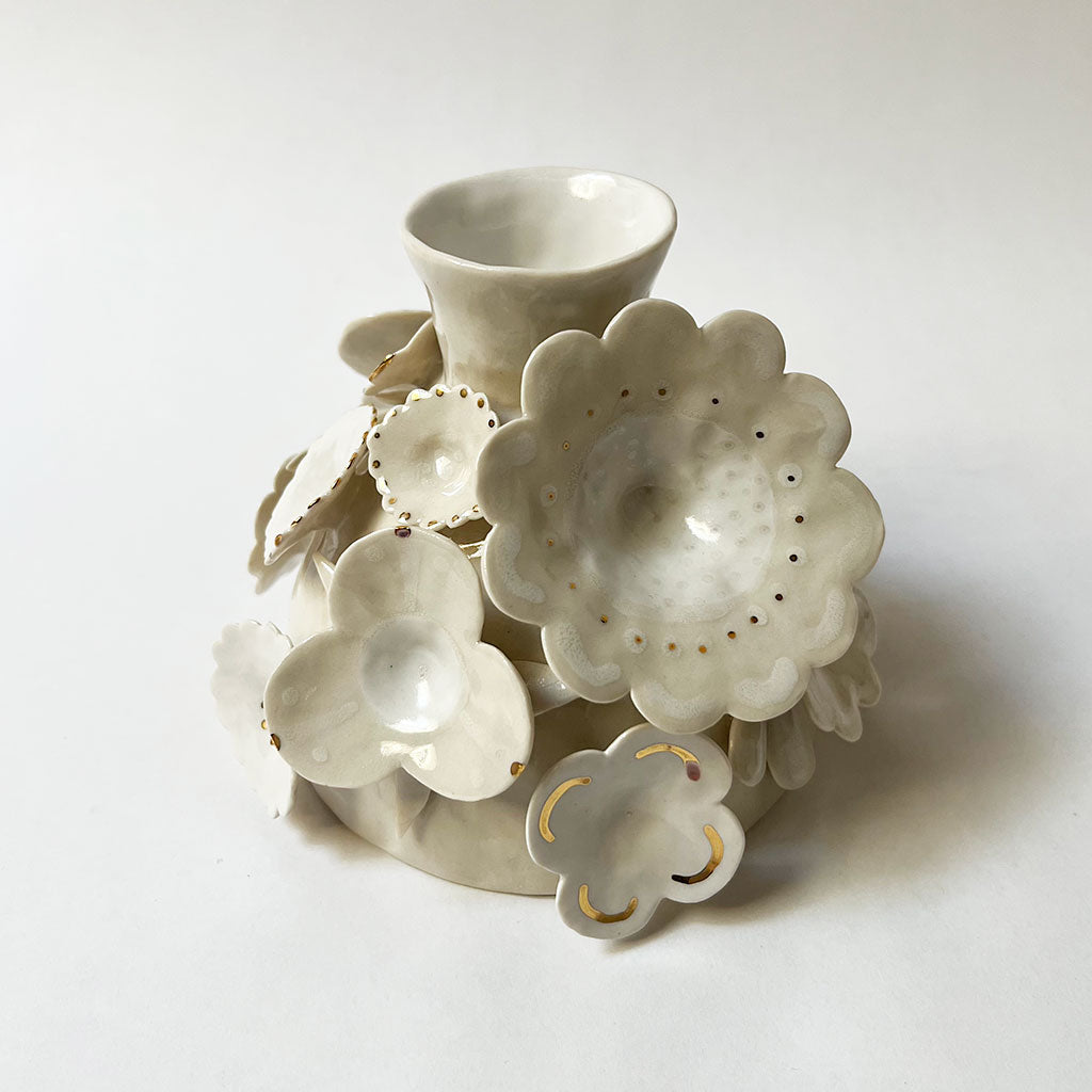 Working with traditional ceramic hand building techniques like pinching and coiling, Melissa Mytty focuses on the vessel form as a base upon which she builds layers of finely sculpted flower shapes. The results are exquisitely sculptural vases adorned with an abundance of delicate, hand-molded flowers bursting forth like spring time blooms in a garden. Each vase is finished with a semi-gloss creamy white glaze and detailed by hand with 22 kt gold accents.