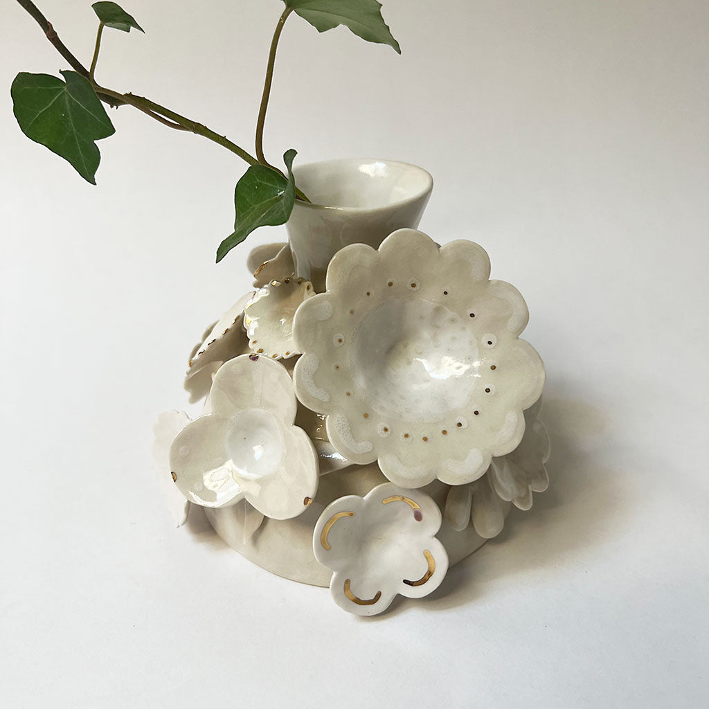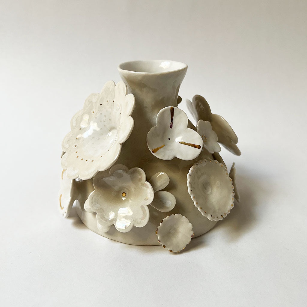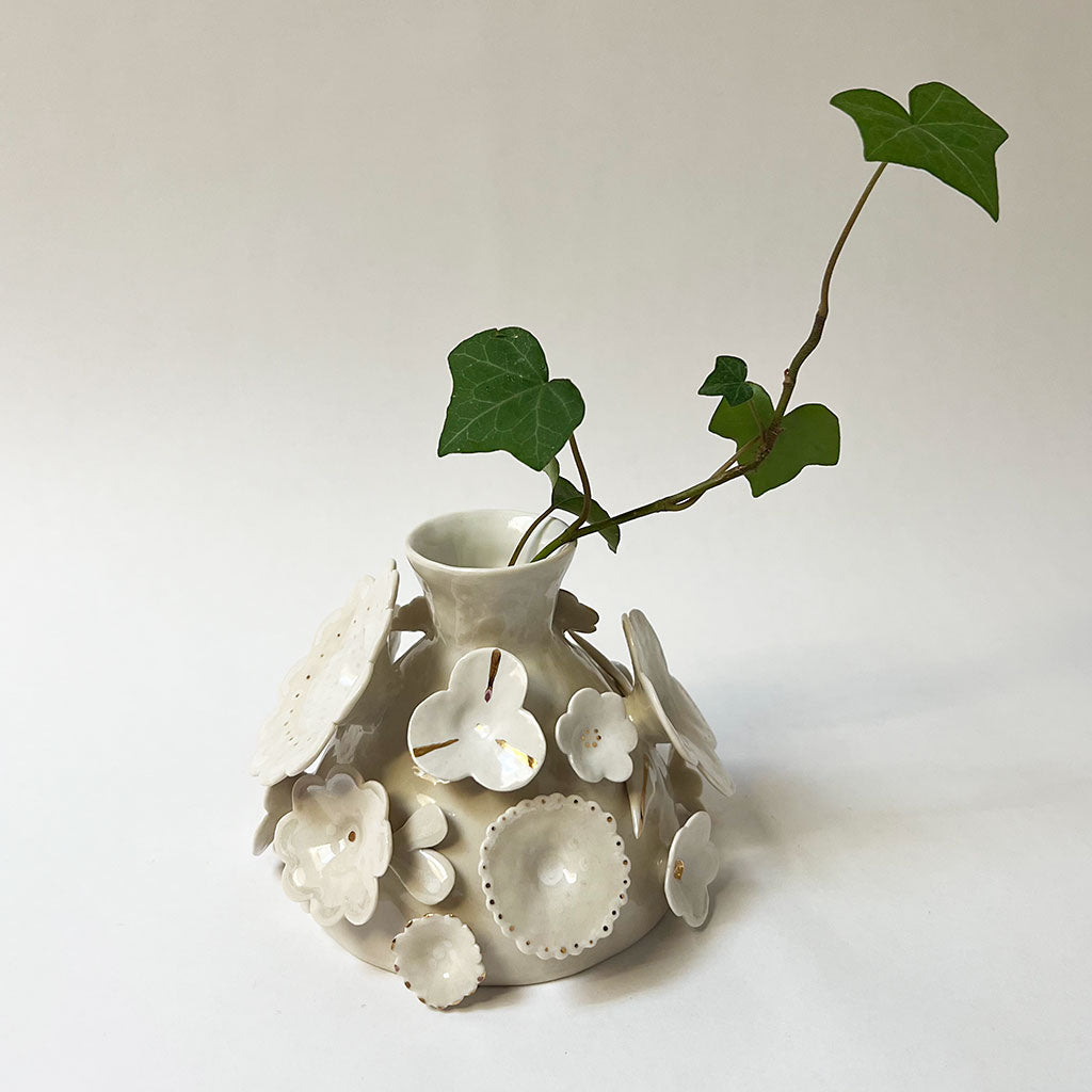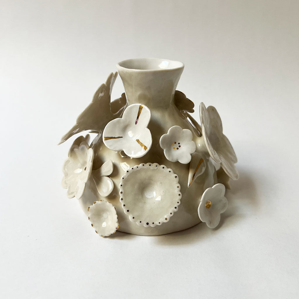 Working with traditional ceramic hand building techniques like pinching and coiling, Melissa Mytty focuses on the vessel form as a base upon which she builds layers of finely sculpted flower shapes. The results are exquisitely sculptural vases adorned with an abundance of delicate, hand-molded flowers bursting forth like spring time blooms in a garden. Each vase is finished with a semi-gloss creamy white glaze and detailed by hand with 22 kt gold accents.