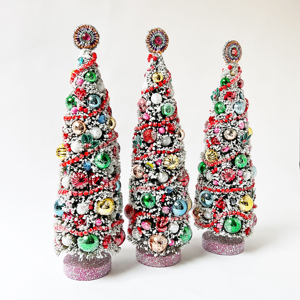 These extra large Deluxe Holiday Bristle Trees are the tallest versions we've ever created in our studio and they are customized with a glittery array of sparkling vintage trim, faceted faux gems, super shiny ornaments and so much more. These trees are so festive (and tall) they're sure to add sparkles and smiles to your holiday season!