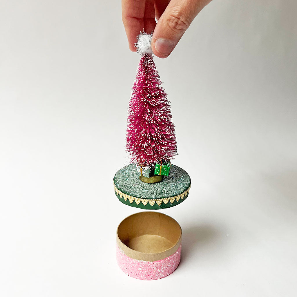 This snow-tipped pink holiday tree decoration is perched on a surprise! The colorful round base trimmed in gold Dresden paper opens to reveal a special gift box perfect for hiding a small gift or candy! Traditionally, these types of disguised gift boxes (or cachettes which means "hiding place" in French) were used for holding candy but we think these would be great for any small scale trinket like jewelry!
