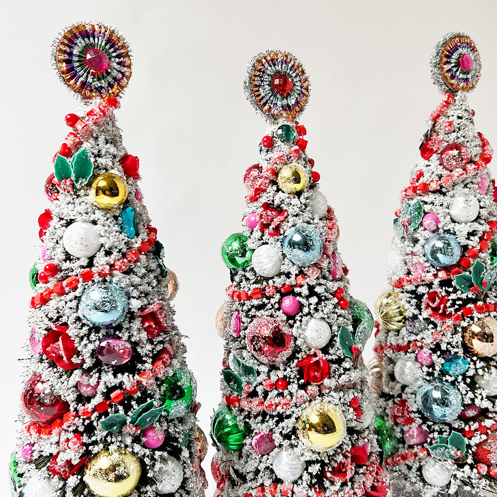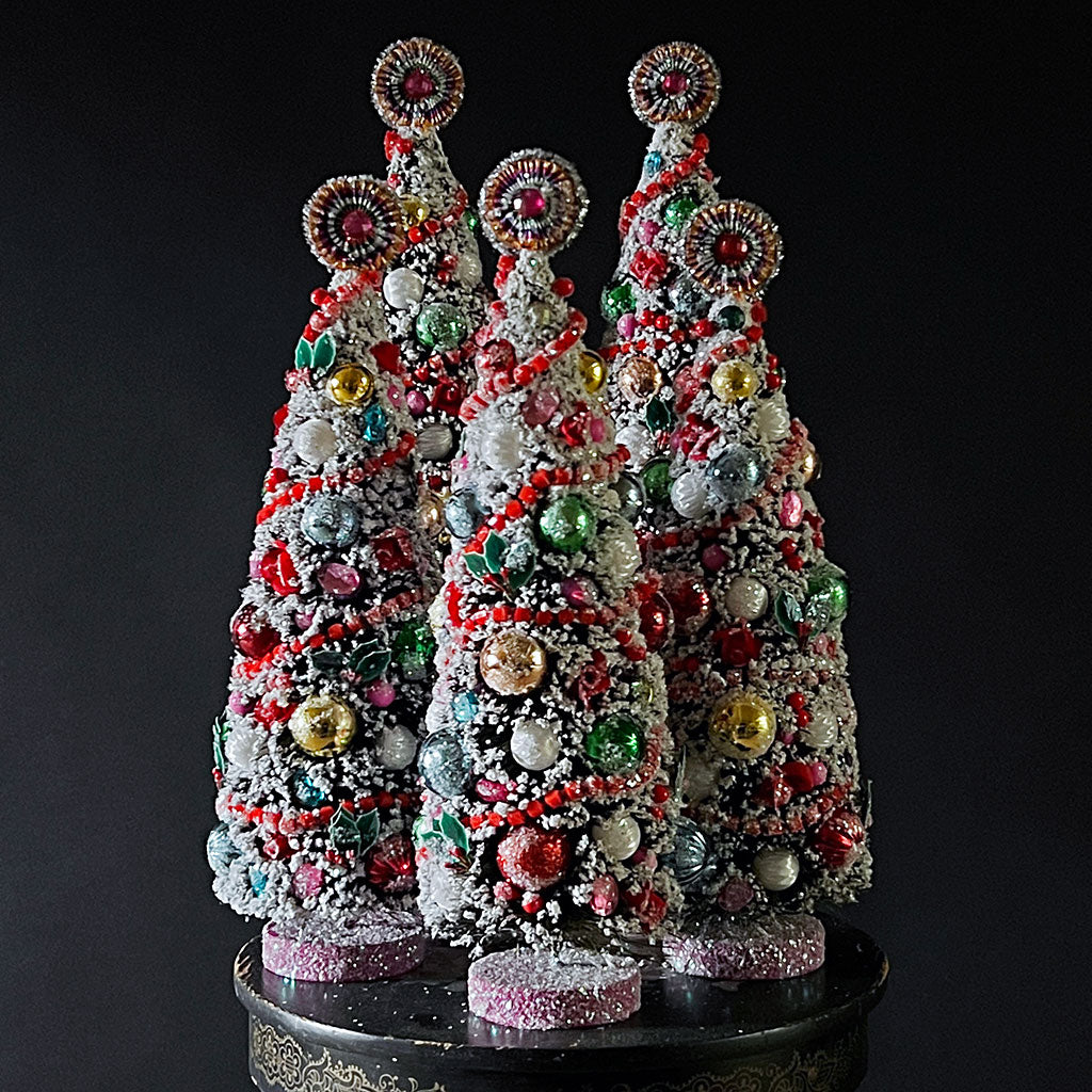 These large Deluxe Holiday Bristle Trees are some of the tallest versions we've ever created in our studio and they are customized with a glittery array of sparkling vintage trim, faceted faux gems, super shiny ornaments and so much more.  These trees are so festive they're sure to add sparkle and smiles to your holiday season!