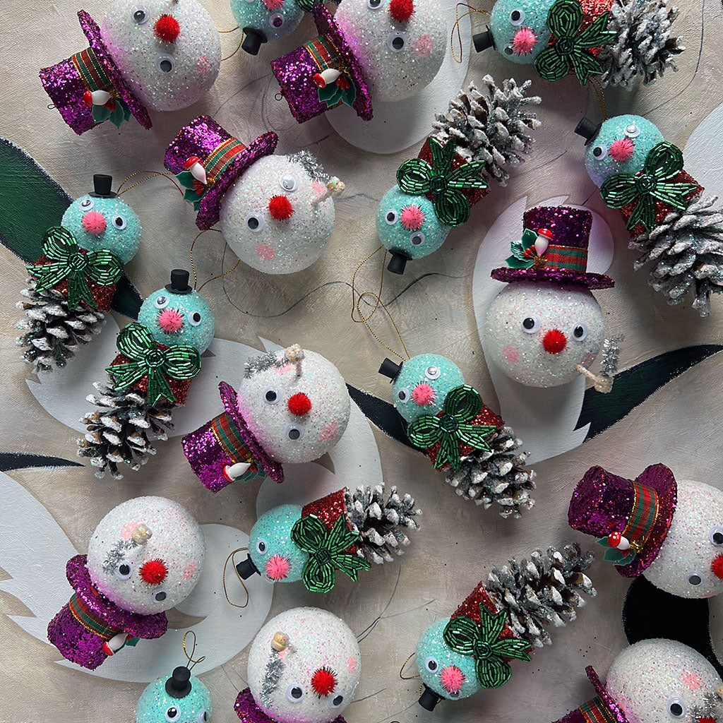 These rosy cheeked, googly eyed snowmen are decked out in magenta top hats accented with a sprig of holly and red cap mushroom.