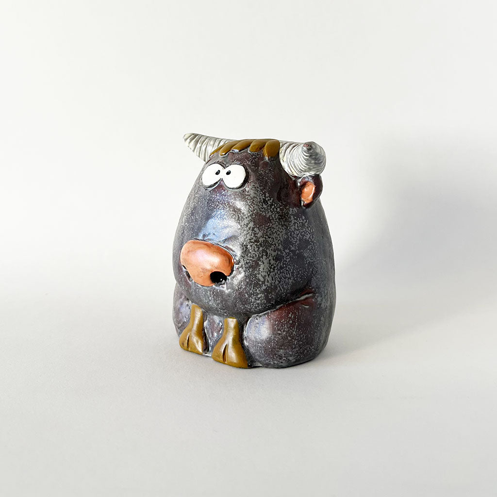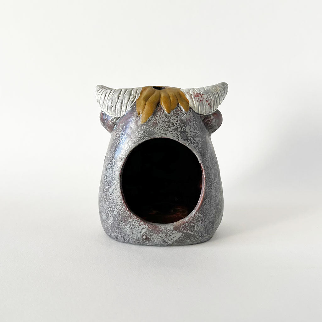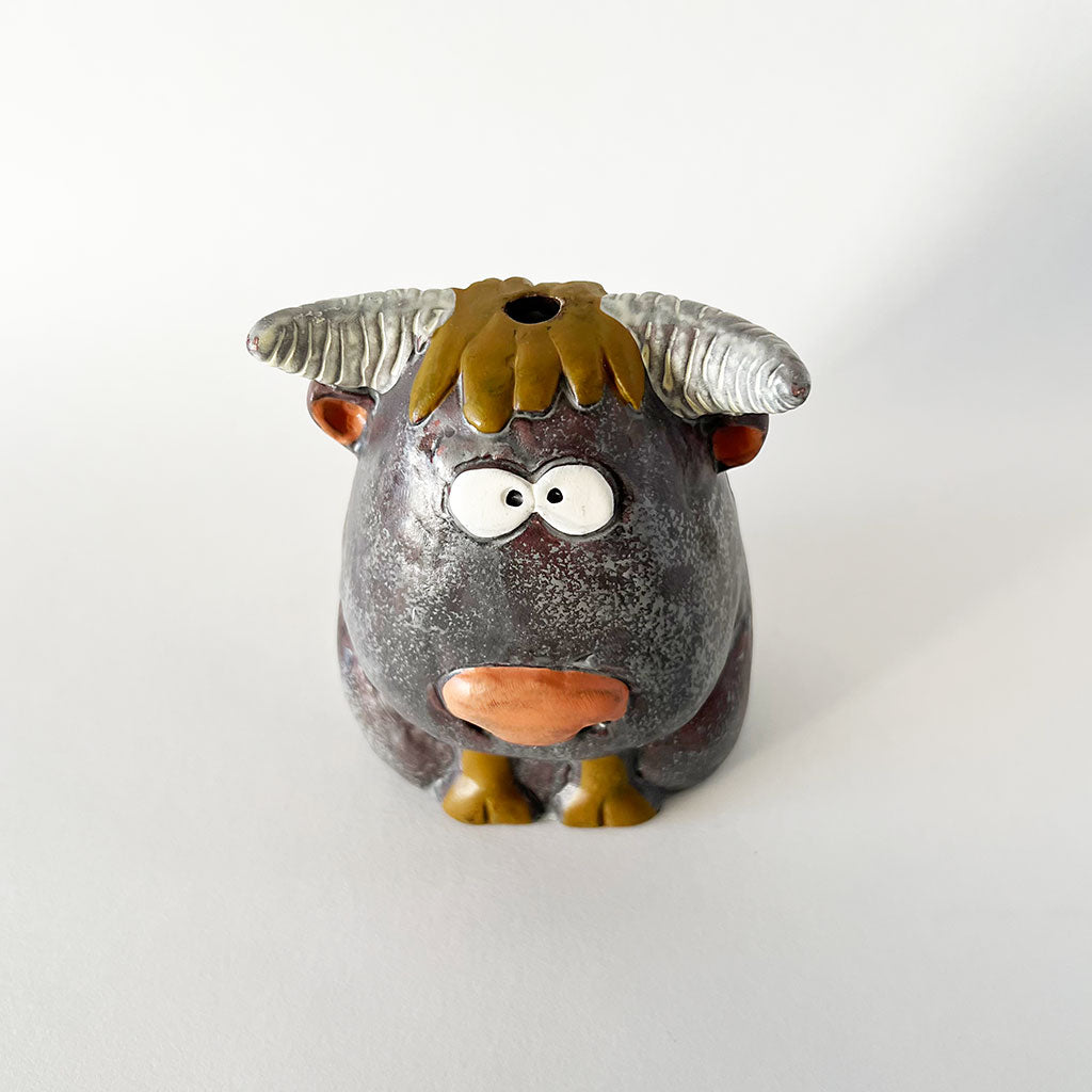 Here, a ceramic incense burner in the shape of a stylized bull with a very expressive face. The back side of this ceramic bull has an opening for placing incense cones. Our favorite feature on this special piece? The incense smoke comes out of the bull's nostrils as well as a hole on his head.