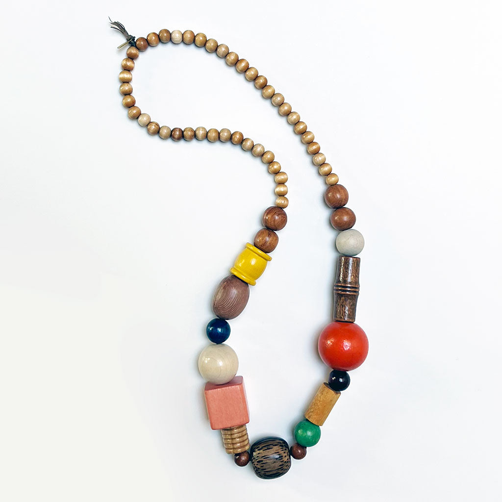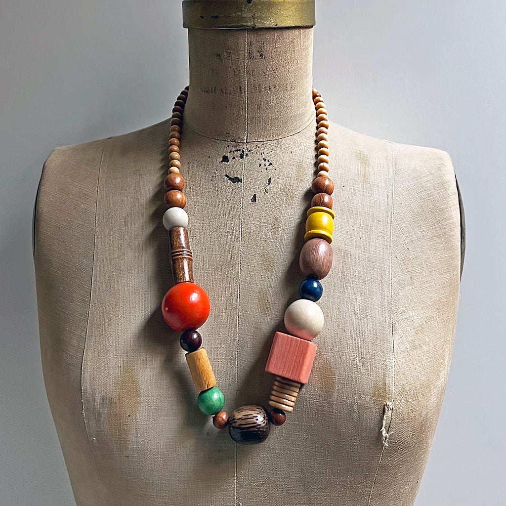 Made from vintage and new beads strung on a waxed poly/cotton cord, each Art Teacher Necklace is a unique asymmetrical composition designed to highlight the beautiful shapes and colors of the wooden beads.