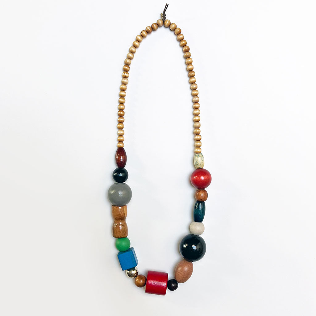 Made from vintage and new beads strung on a waxed poly/cotton cord, each Art Teacher Necklace is a unique asymmetrical composition designed to highlight the beautiful shapes and colors of the wooden beads.