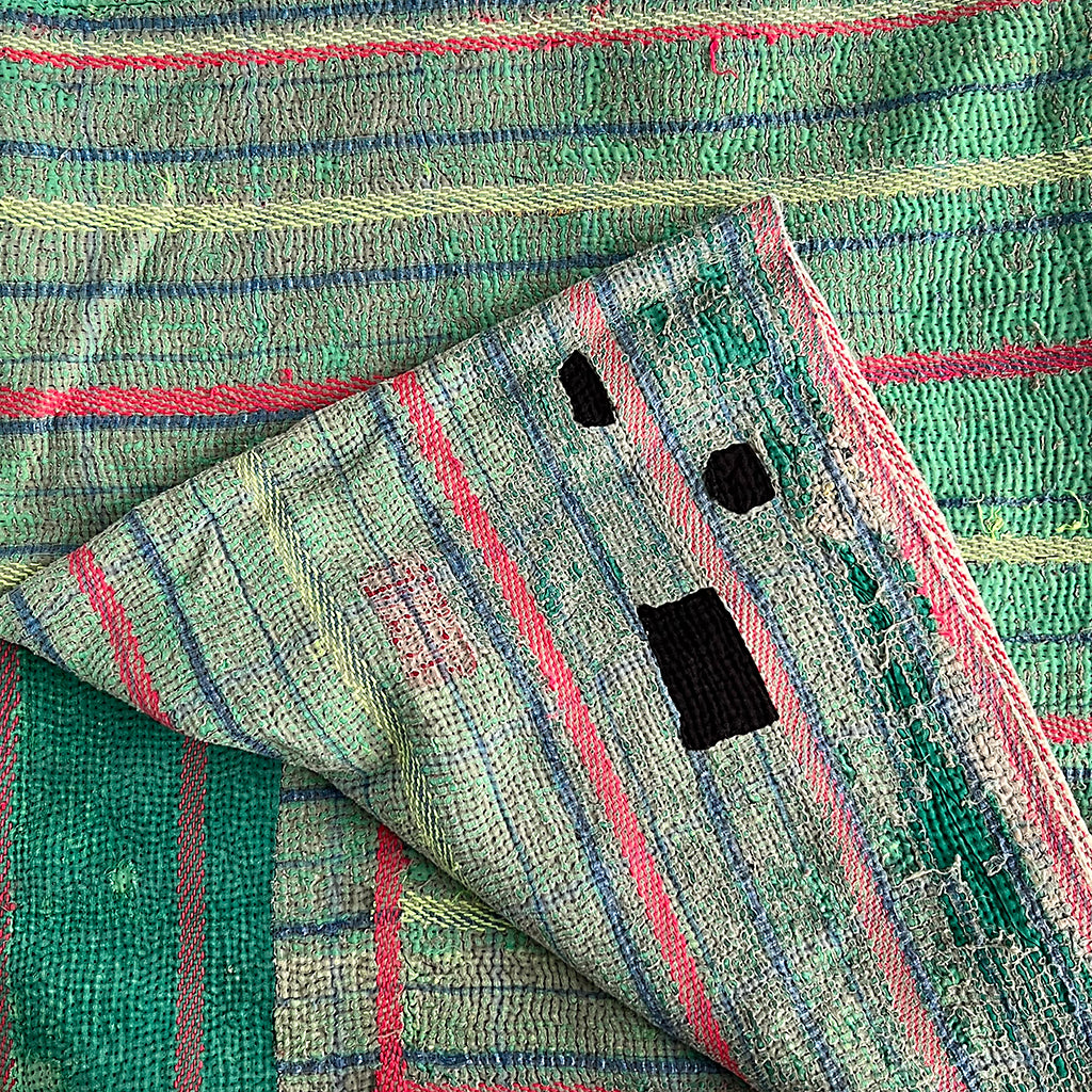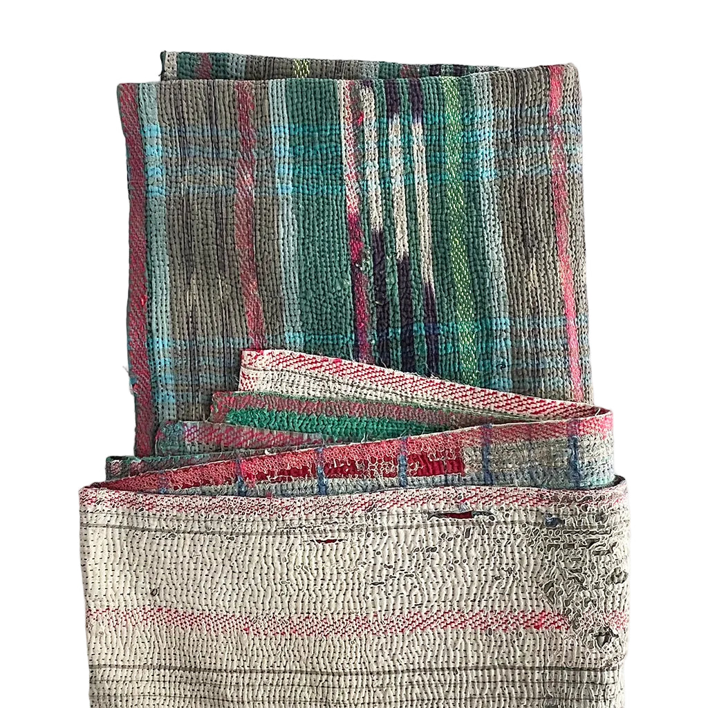 The lofty, breathable feel of these vintage kantha blankets is achieved through multiple layers of cotton fabric assembled with hand-sewn running stitches resulting in a super soft and reversible throw. Kantha blankets are made from vintage textiles that have various unique characteristics due to age including fading, worn areas, patches and embroidered repairs. Sometimes areas of the top fabric are worn to the point where sections of an underlying pattern show through faintly. We think the visible mending evident in these throw blankets is what gives them character making each blanket special and one of a kind.