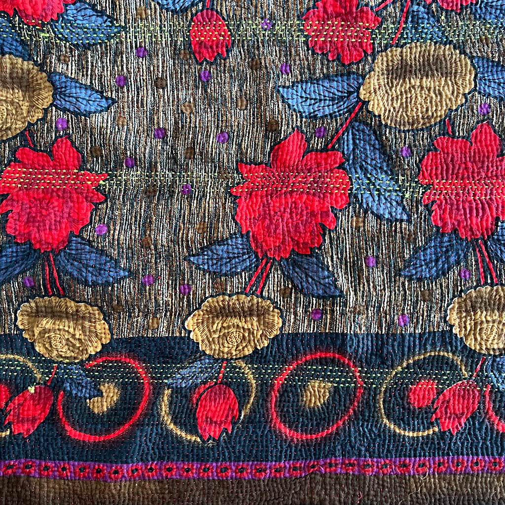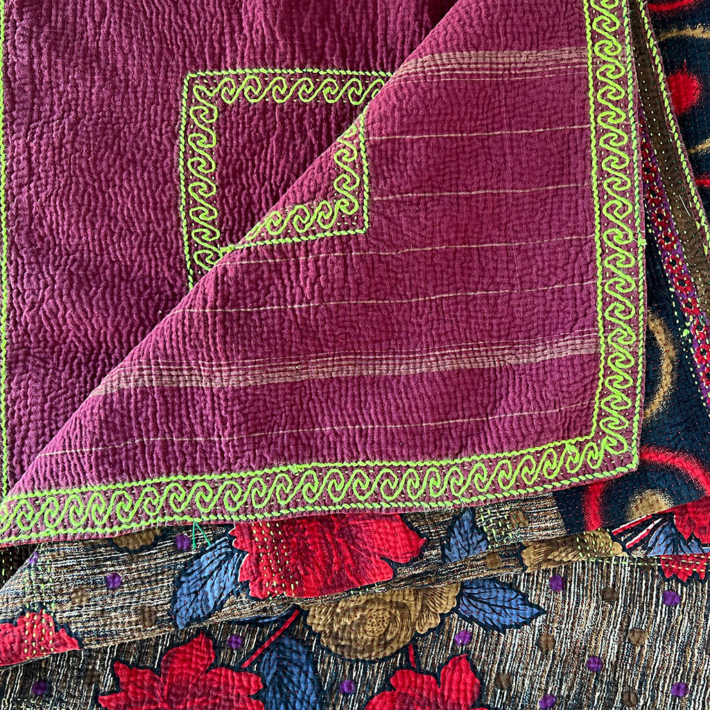 The lofty, breathable feel of these vintage kantha blankets is achieved through multiple layers of cotton fabric assembled with hand-sewn running stitches resulting in a super soft and reversible throw. Kantha blankets are made from vintage textiles that have various unique characteristics due to age including fading, worn areas, patches and embroidered repairs. Sometimes areas of the top fabric are worn to the point where sections of an underlying pattern show through faintly. We think the visible mending evident in these throw blankets is what gives them character making each blanket special and one of a kind.