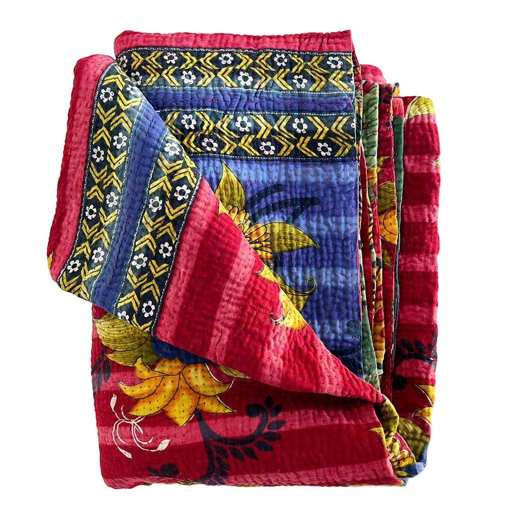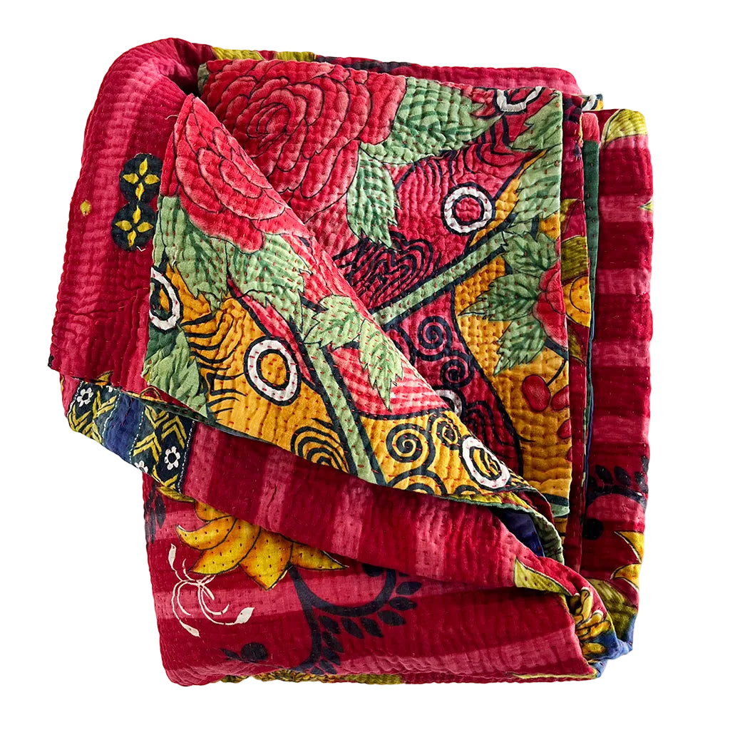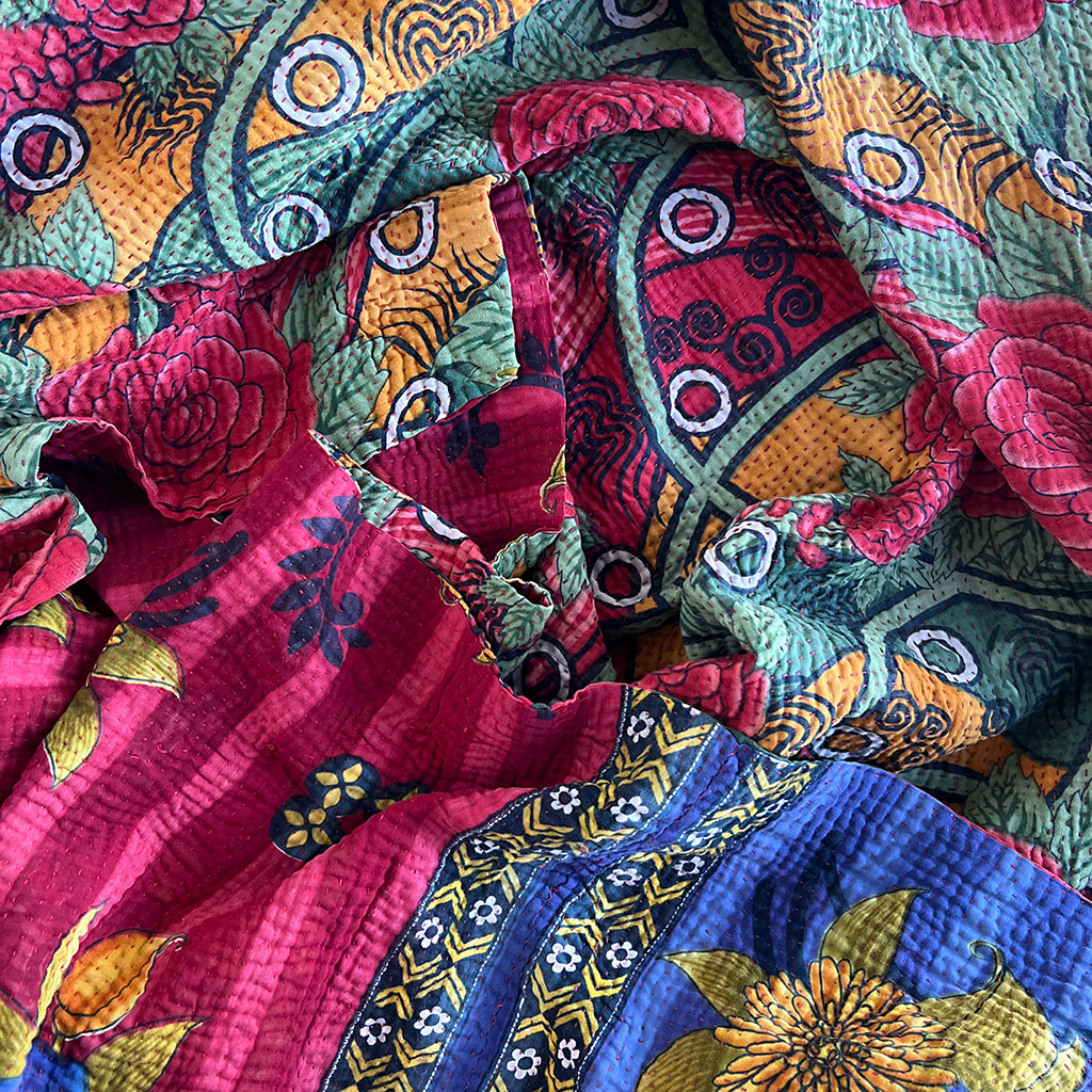 The lofty, breathable feel of these vintage kantha blankets is achieved through multiple layers of cotton fabric assembled with hand-sewn running stitches resulting in a super soft and reversible throw.  Kantha blankets are made from vintage textiles that have various unique characteristics due to age including fading, worn areas, patches and embroidered repairs.  Sometimes areas of the top fabric are worn to the point where sections of an underlying pattern show through faintly. We think the visible mending evident in these throw blankets is what gives them character making each blanket special and one of a kind.