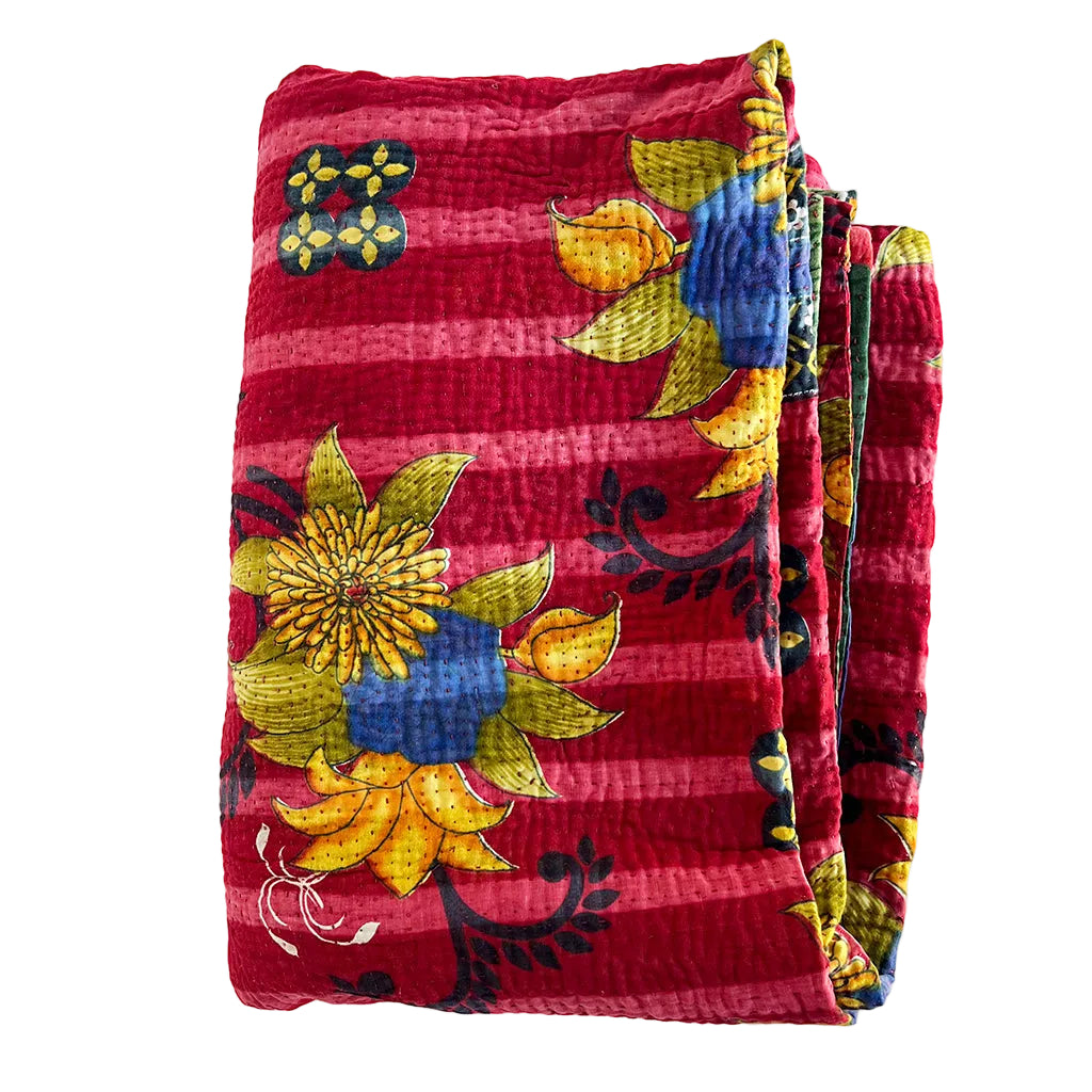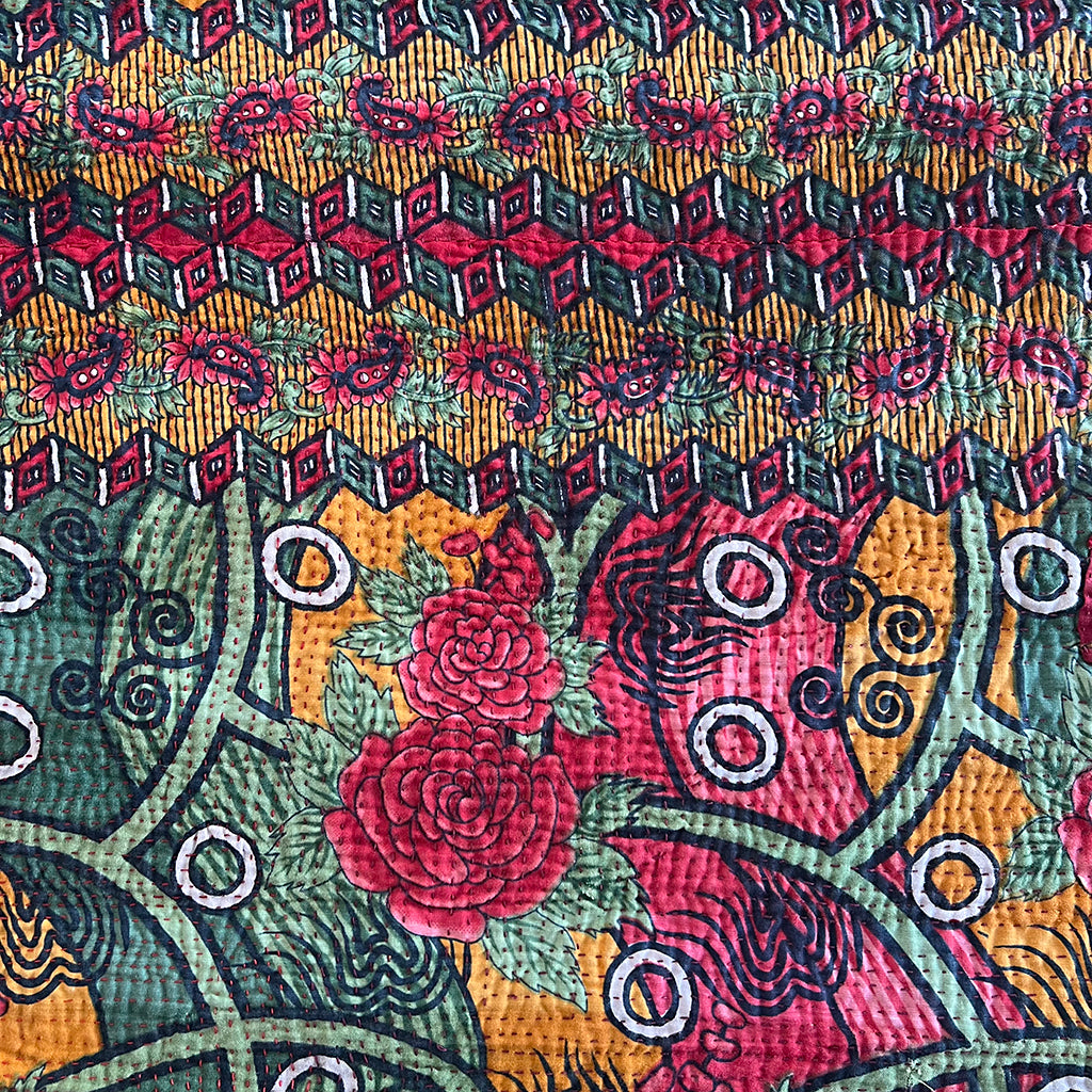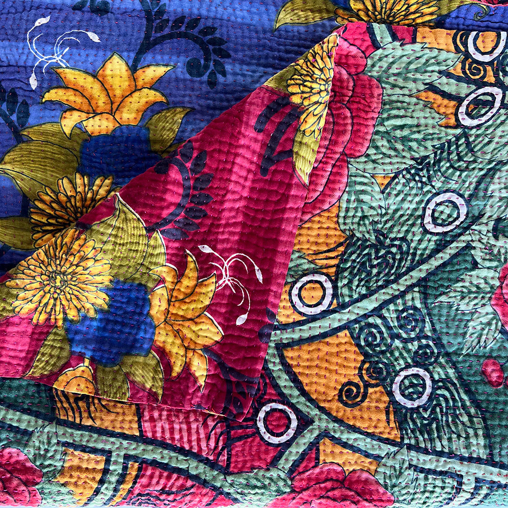 The lofty, breathable feel of these vintage kantha blankets is achieved through multiple layers of cotton fabric assembled with hand-sewn running stitches resulting in a super soft and reversible throw.  Kantha blankets are made from vintage textiles that have various unique characteristics due to age including fading, worn areas, patches and embroidered repairs.  Sometimes areas of the top fabric are worn to the point where sections of an underlying pattern show through faintly. We think the visible mending evident in these throw blankets is what gives them character making each blanket special and one of a kind.