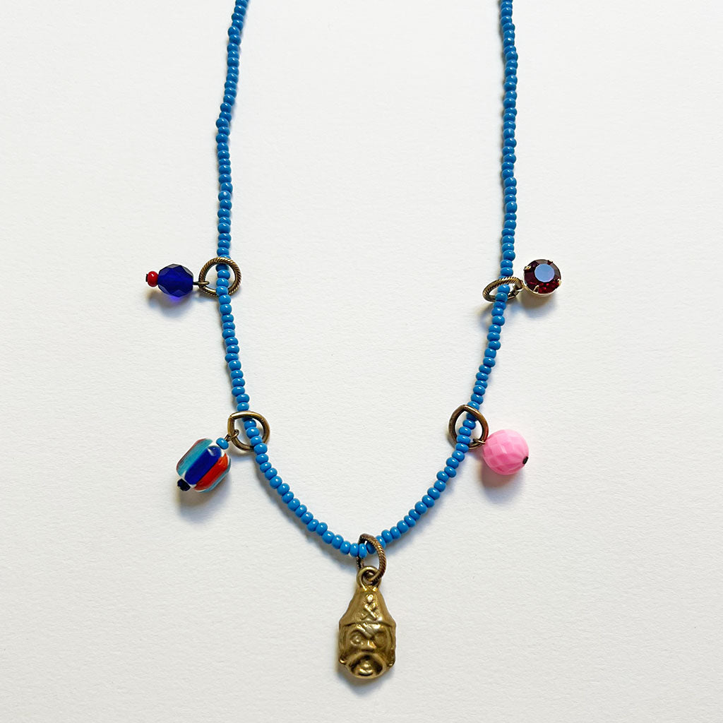 This one-of-a-kind necklace features a mix of new and vintage elements including glass and lucite beads combined with a Swarovski crystal and a solid brass pirate charm all hanging from a strand of blue colored glass seed beads on waxed poly/cotton cord.