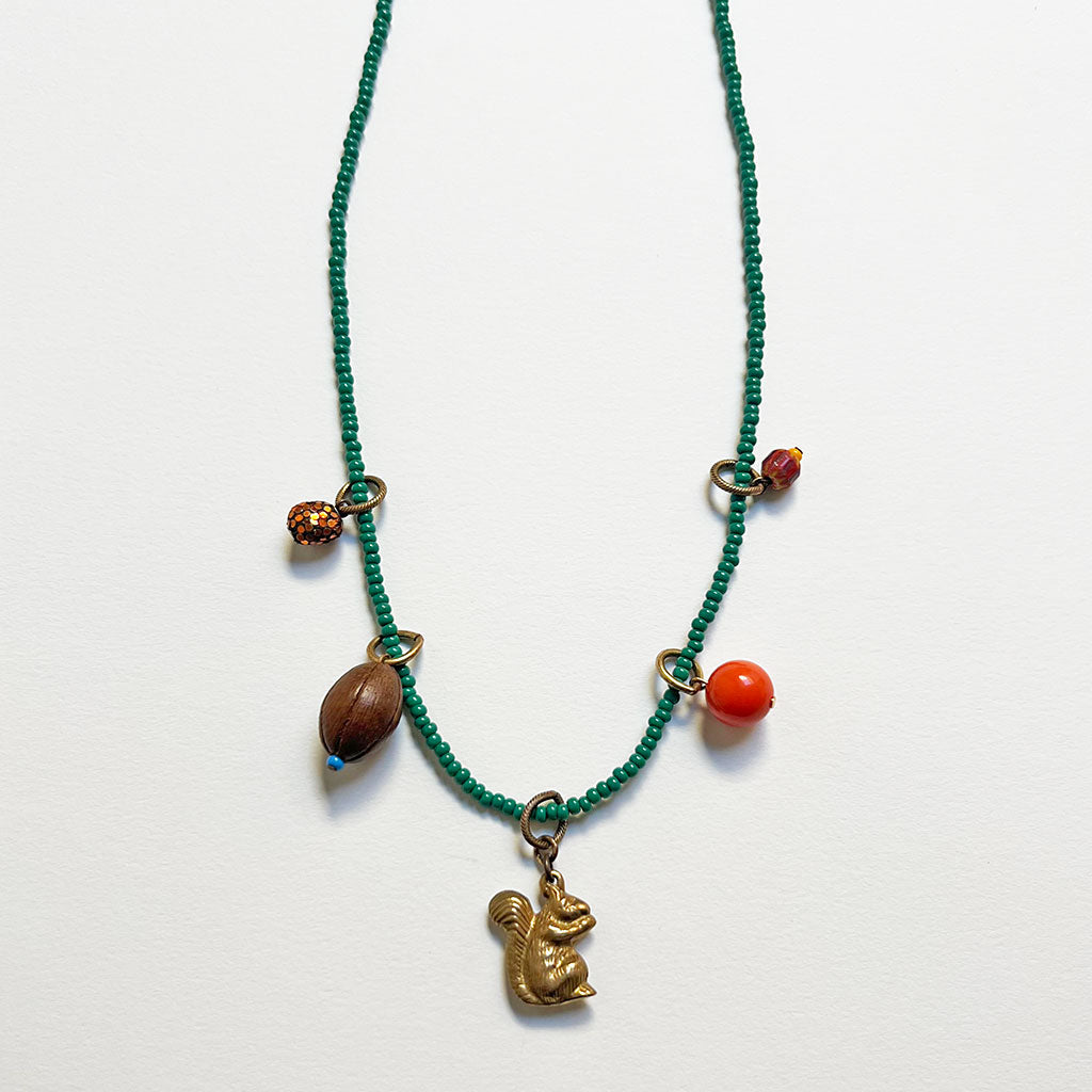 This one-of-a-kind necklace features a mix of new and vintage elements including glass, glitter, wood and lucite beads combined with a Swarovski crystal and a solid brass squirrel charm all hanging from a strand of green colored glass seed beads on waxed poly/cotton cord.
