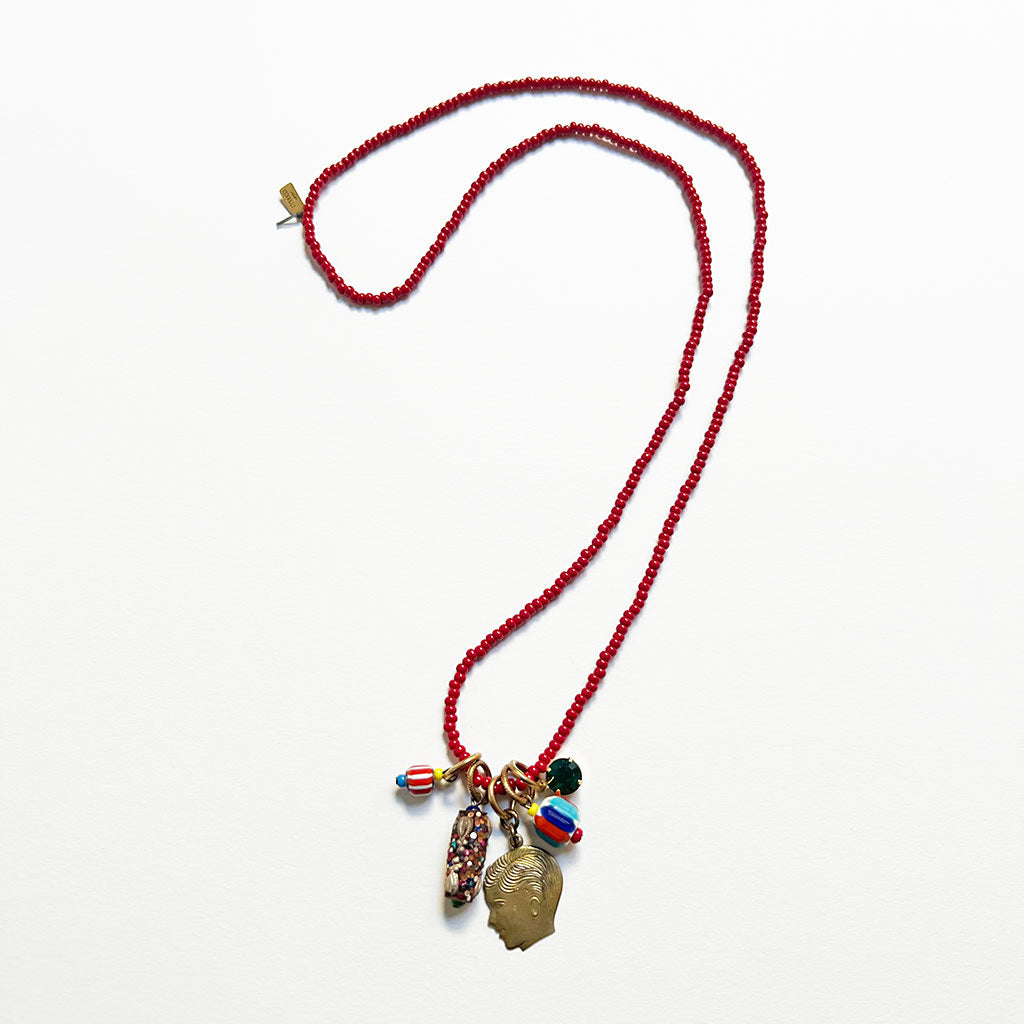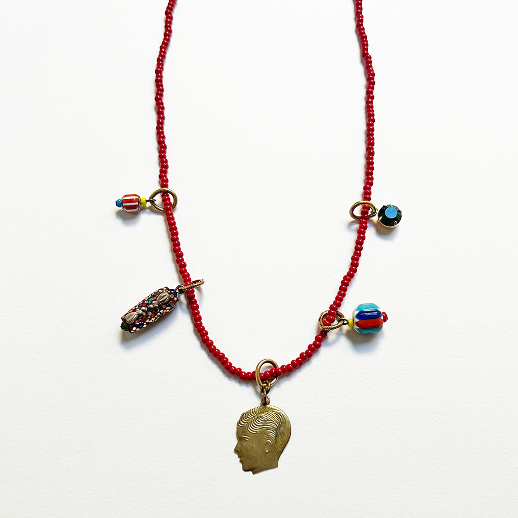 This one-of-a-kind necklace features a mix of new and vintage elements including glass and glitter beads combined with a Swarovski crystal and a solid brass little boy profile charm all hanging from a strand of red colored glass seed beads on waxed poly/cotton cord.