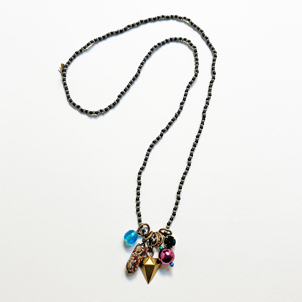 This one-of-a-kind necklace features a mix of new and vintage elements including glass, glitter and lucite beads combined with a Swarovski crystal and a solid brass cut gem charm all hanging from a strand of alternating black and grey colored glass seed beads on waxed poly/cotton cord.