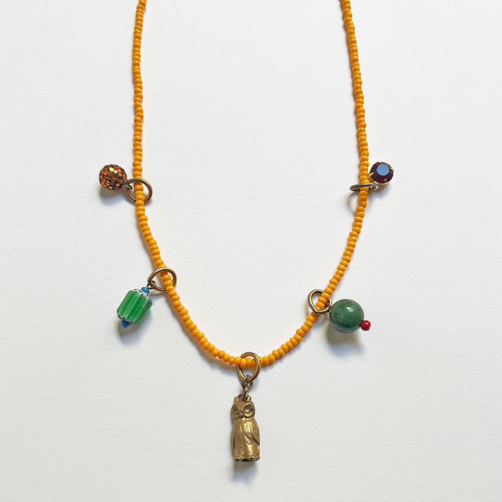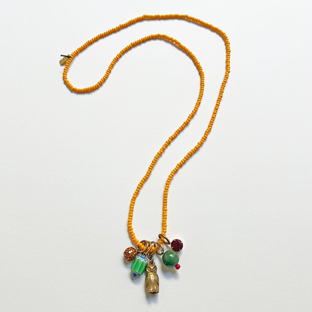 This one-of-a-kind necklace features a mix of new and vintage elements including glass, glitter and lucite beads combined with a Swarovski crystal and a solid brass owl charm all hanging from a strand of marigold colored glass seed beads on waxed poly/cotton cord.