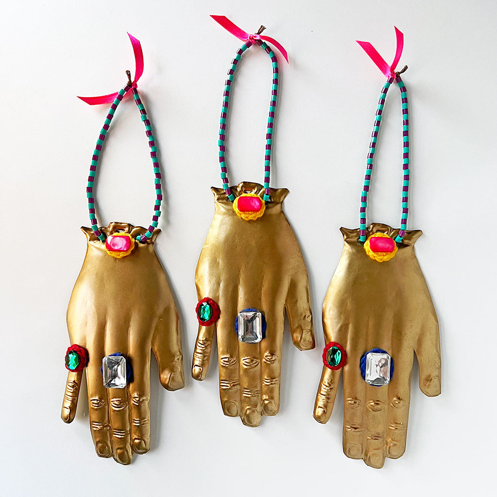 Our jeweled brass hands are back and sparkling like never before! Accessorized with faux jewelry made from hand-crochet discs, vintage shell and acrylic gems, this bedazzled hand is finished with multi colored beads and a fluorescent ribbon for easy hanging.
