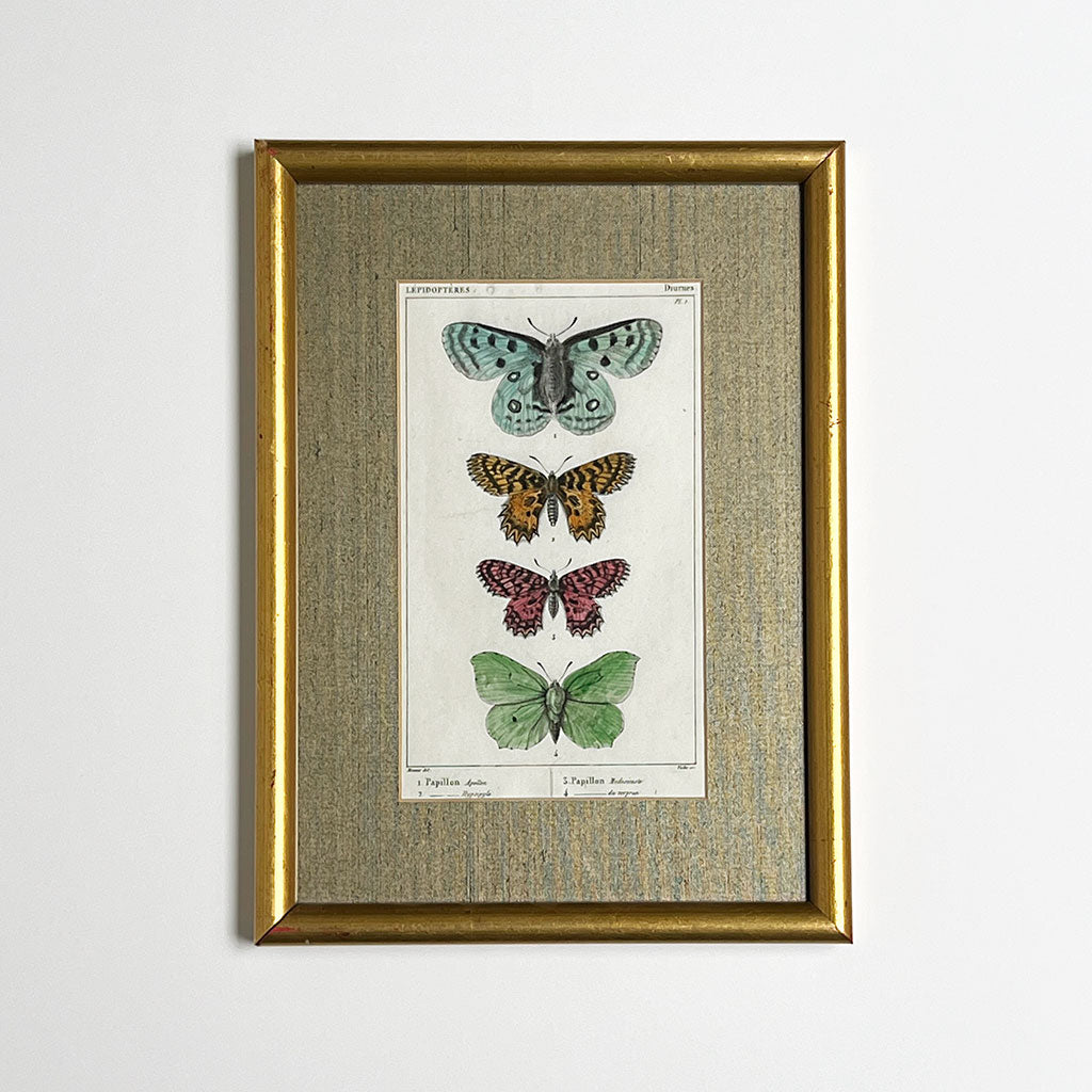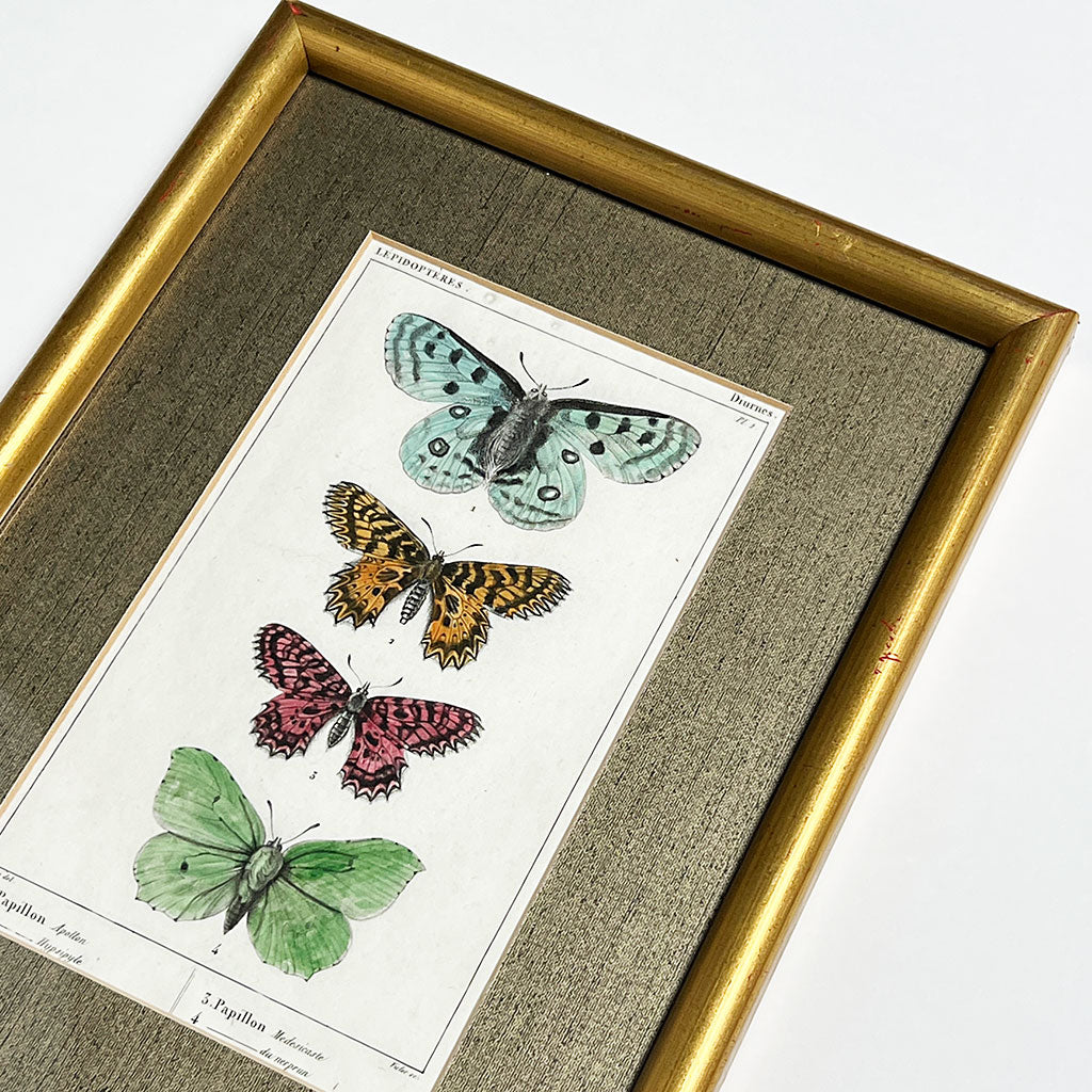 Four Butterflies (Papillons)- Original Hand-Colored French Engraving in Vintage Frame