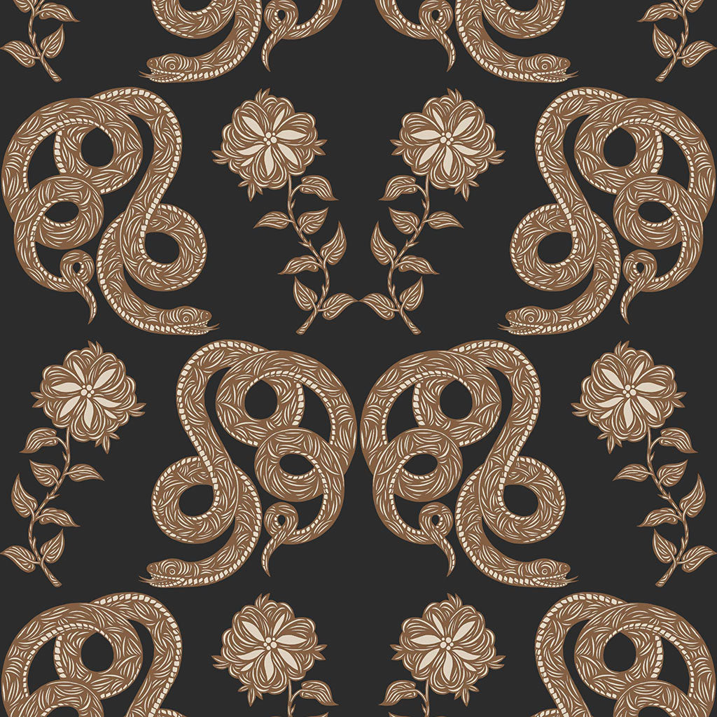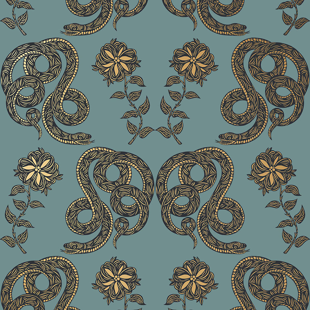 Inspiration: In the garden of the unexpected, a mysterious snake rests beneath the sweet-smelling canopy of benevolent wildflowers. Both the reptile’s winding body and the flower’s looping curves give this pattern a poetic fluidity much like its namesake.