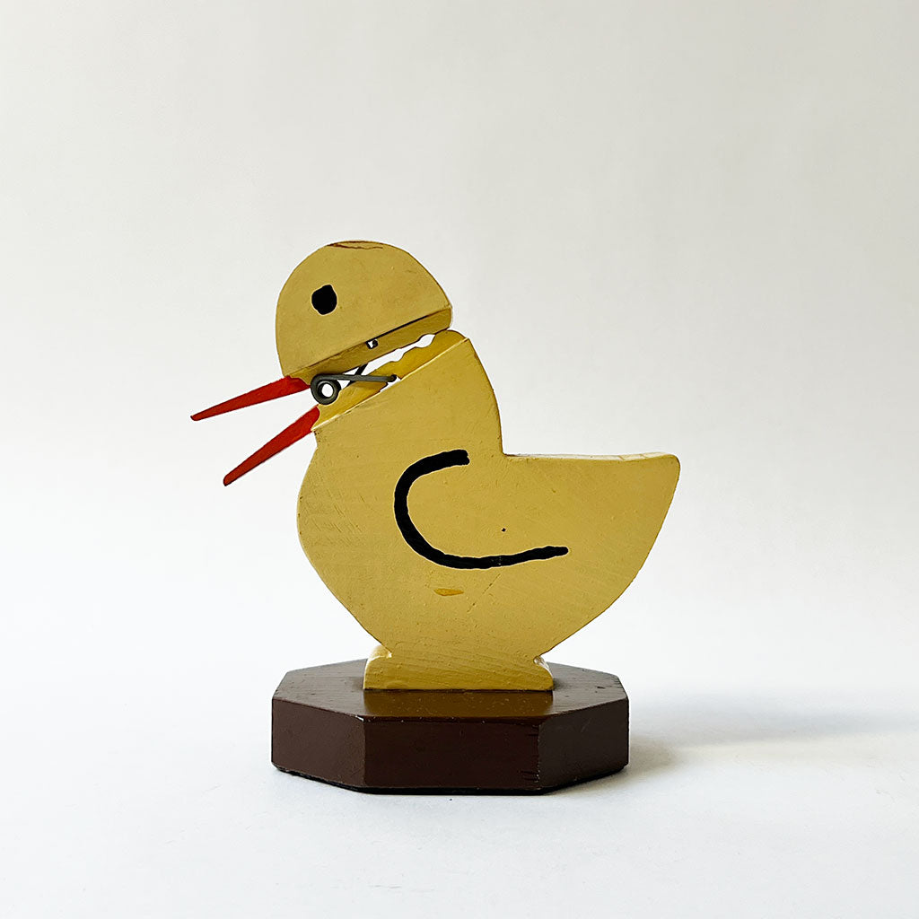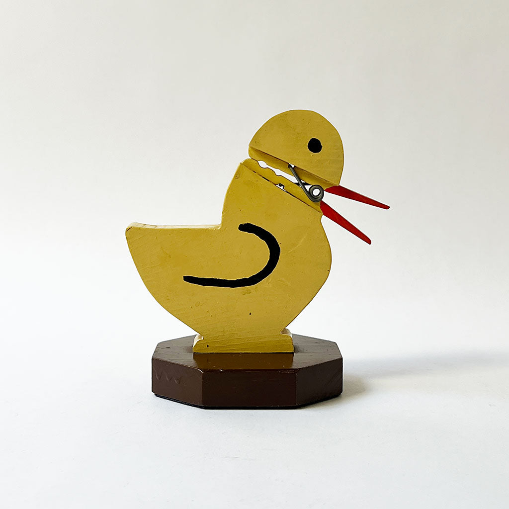 Here, a very clever handmade wood duck on a base utilizing a clothespin as both the beak and a memo holder! This is a great handcrafted sculptural and functional piece.